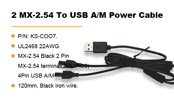 KS-C007: 2 MX-2.54 To USB A/M Power Cable 1. P/N: KS-C007 2. Cable: UL2468 22awg(32/0.12BC+1000D Nylon silk)x2F, ID1.8mm, OD3.6mm, L1000mm, 1PCS UL2068 22awg(17/0.16BC)x2F, ID1.8mm, OD3.6mm, L185mm, 2PCS 6. Connector: MX-2.54 Black 2 Pin MX...